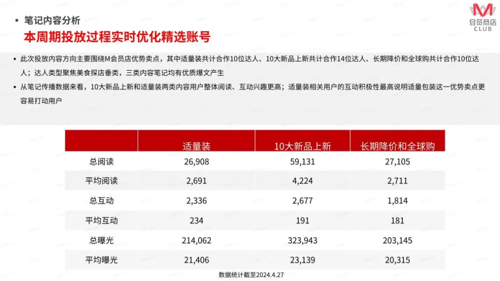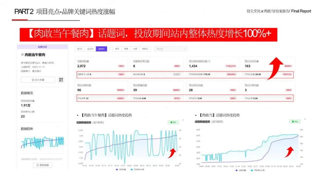 侵尘高度重视不同内容形式的传播效能。在「大润发M会员店」项目中,数据表明视频报备笔记的平均互动量达1090,显著优于图文形式。据此,团队迅速调整内容策略,建议后续阶段提升视频笔记占比。此外,还系统化测试多种内容方向,例如「肉敢当」项目中的美食教程、零食分享、美食吃播等,依托数据反馈识别高爆文率的内容模型,并实现规模化复制。
