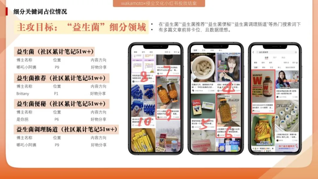 在确认人群定位和内容方向后,侵尘随即布局关键词占位与搜索优化。侵尘在“益生菌”“益生菌推荐”“益生菌便秘”等高流量搜索词下进行内容卡位,确保品牌在用户搜索时能够稳固占据前排位置。通过持续的内容输出与关键词优化,WAKAMOTO在相关词条下的曝光率得到显著提升,为品牌带来源源不断的自然流量。