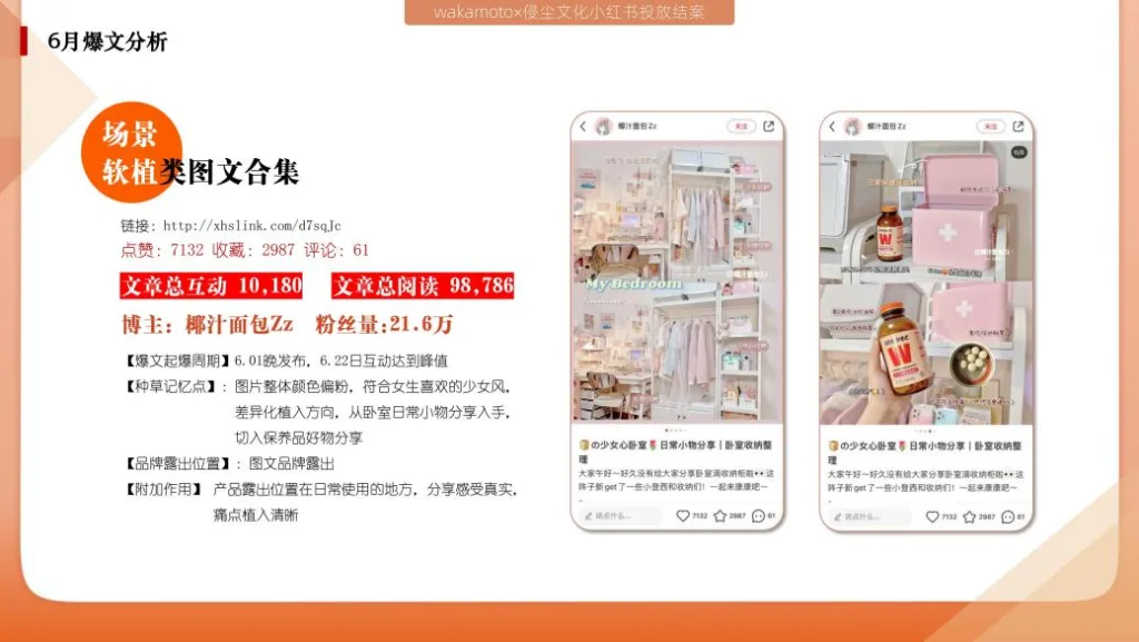 通过深入分析小红书平台的用户行为,侵尘将WAKAMOTO的目标人群精准锁定为“流行男女”“瘦身人群”“品质吃货”等具有高消费意愿与健康意识的群体。在内容方向上,主打“好物分享+精准痛点+信息流助推”这一组合策略,覆盖图文种草、视频软植入等多种形式,确保内容既具吸引力,又具转化力。