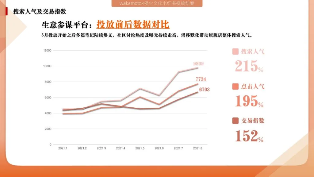 数据显示,WAKAMOTO在小红书的搜索人气在投放后提升215%,点击人气增长195%,交易指数上升152%。品牌词“WAKAMOTO”“WAKAMOTO益生菌”在搜索结果中实现高位占位,显著提升了旗舰店的引流效果。