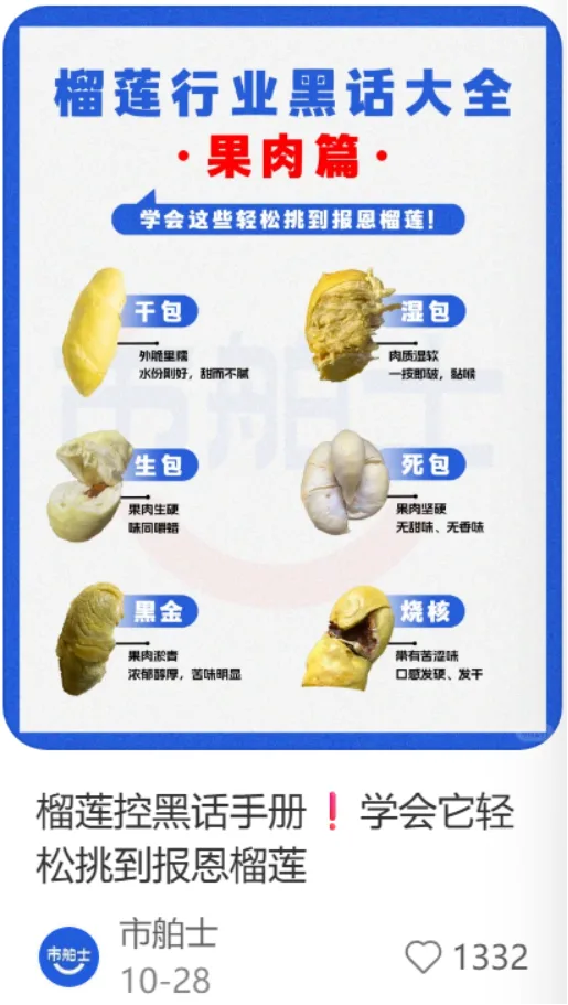 侵尘文化在为进口水果品牌「市舶士」推广猫山王榴莲时,就精准捕捉到了这一机遇。通过深入分析小红书站内的高频搜索词,团队发现用户对“如何辨别真假猫山王”“冷冻榴莲解冻后口感不佳怎么办”等问题极为关注。