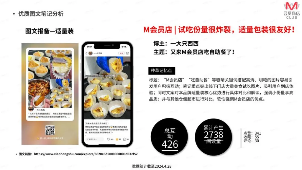 在为「大润发M会员店」策划营销方案时,团队围绕“M会员店是否值得加入”“M会适量装VS大包装”等对比性关键词,携手本地生活的意见领袖(KOC),创作了多篇多维度体验的内容。例如,《M会员店|试吃份量很炸裂,适量包装很友好!》一文,既展现了M会员店的独特优势,又避免了对竞品的贬低,赢得了用户的广泛信任。