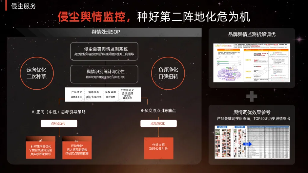侵尘会进行关键词监测,覆盖品牌词、产品词、竞品词,并建立分级响应机制。侵尘会在日常维护中主动管理与达人的关系,从源头减少舆情的发生。